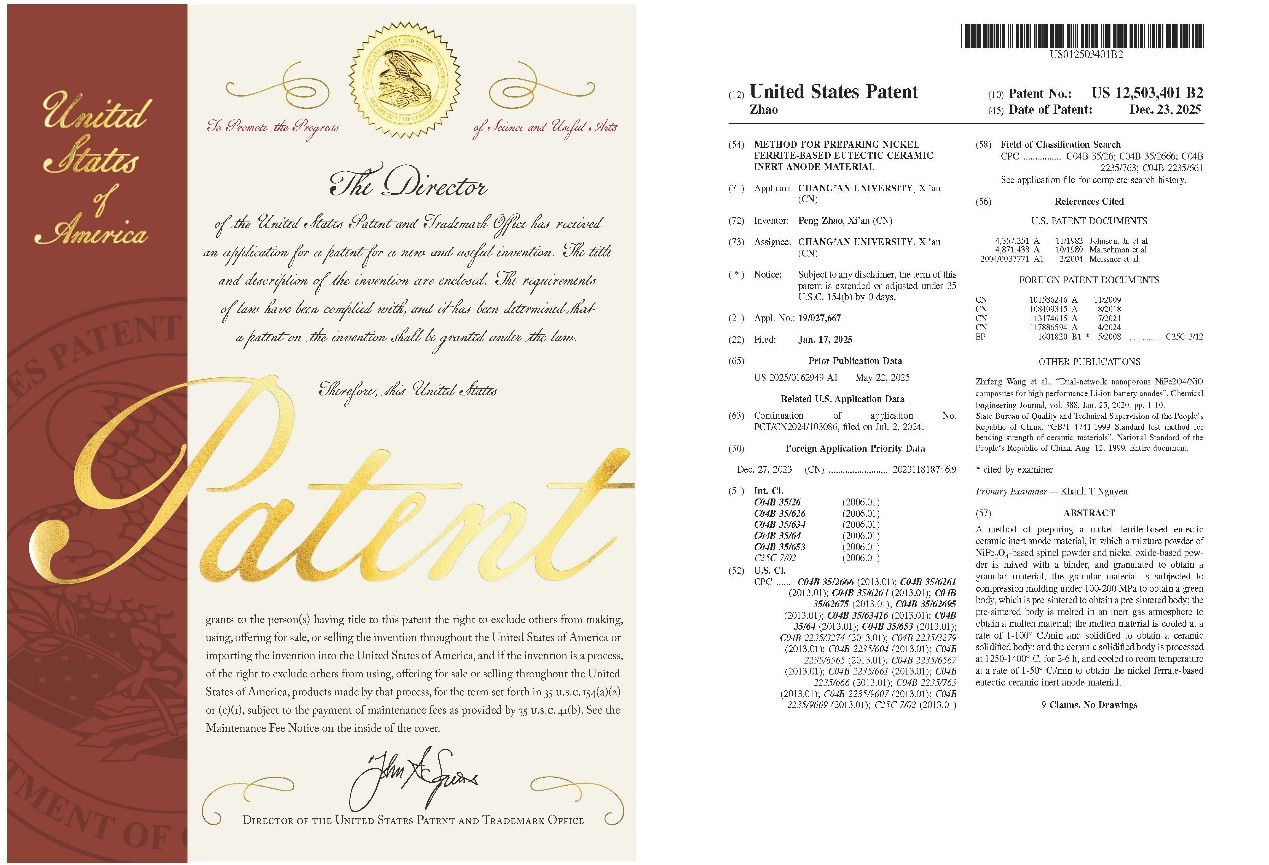 近日,我院赵鹏教授科研团队研发的共晶陶瓷惰性阳极材料正式获得美国发明专利授权(专利号:US 12,503,401 B2)。该专利突破有色金属熔盐电解关键材料瓶颈,在零碳电解铝、零碳电解镁等绿色冶金领域具备重大产业化价值,标志着我院在先进电极材料与低碳冶金交叉方向取得了具有国际影响力的原创成果。
